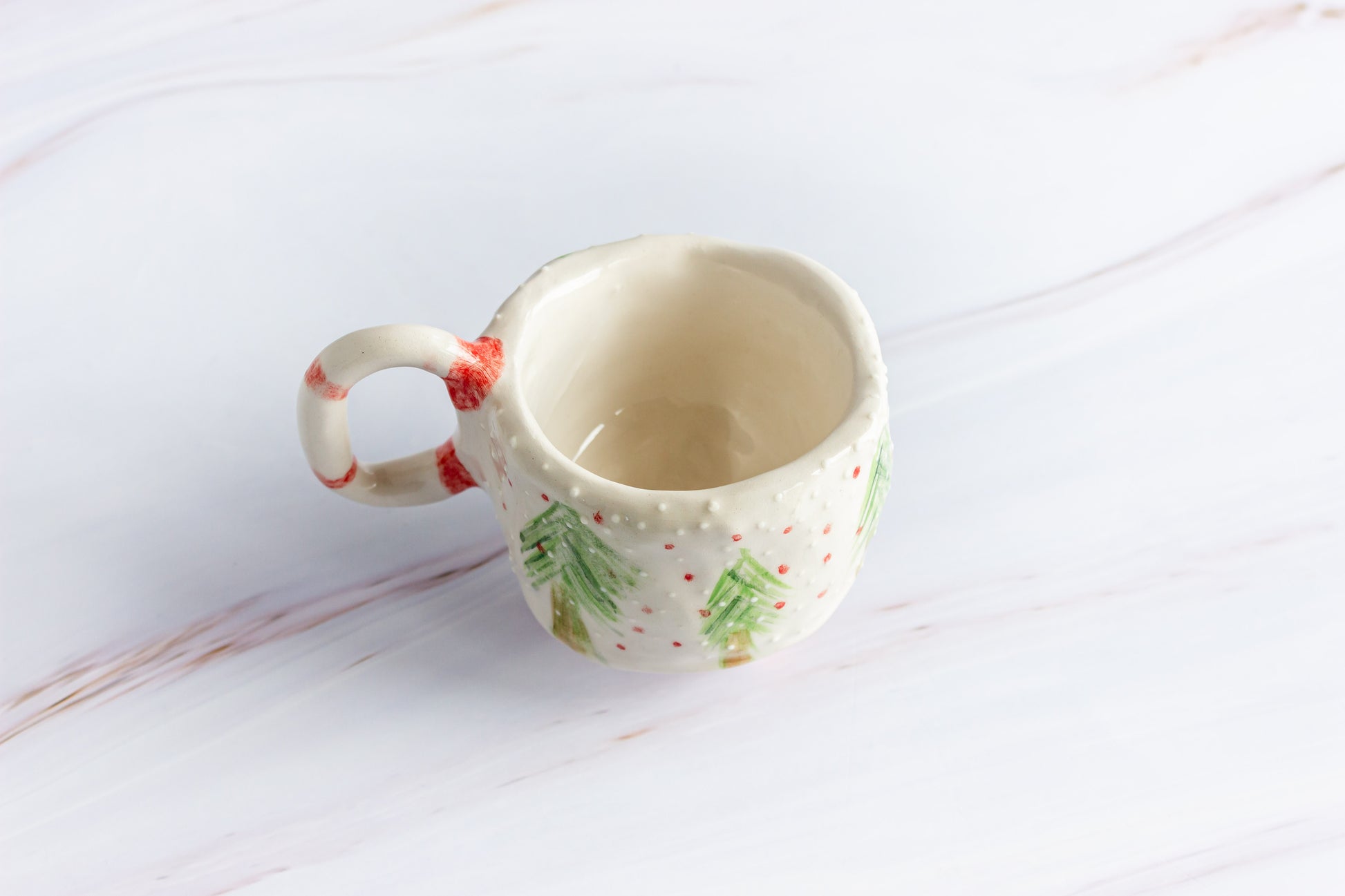 This handmade christmas ceramic coffee mug has a unique design with handpaint christmas trees.